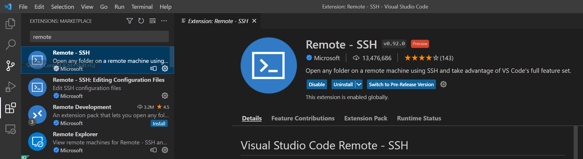 - 설치 후 확장 기능을 눌른다음 remote라고 입력하면 remote ssh가 나올 텐데 install을 눌러 준다(나는 이미 설치를 했기 때문에 다른 설치 후 화면이다)
