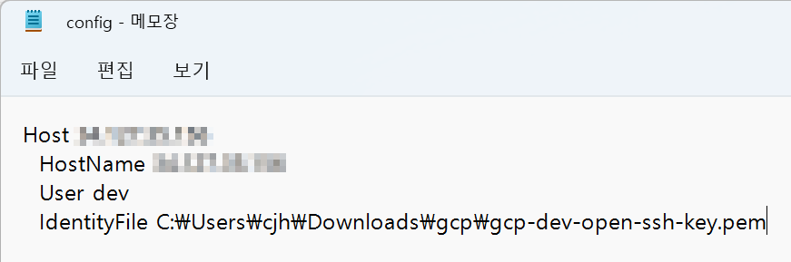 - 인증키를 입력하기 위해 아까 생성된 config 파일을 연 다음 IdentityFile C:\pem파일 경로\파일명.pem 를 입력한다