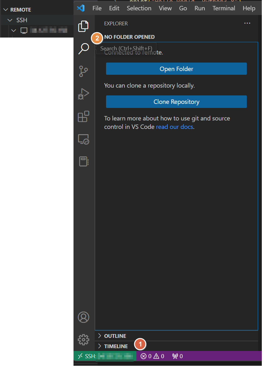 - 화면 왼쪽 상단에 파일들이 겹친 이모티콘을 누르면 Open Folder이 나오는데 눌르면 원격 리눅스 서버의 폴더 경로들이 나오고 원하는 폴더 경로를 선택하면 폴더에 포함된 모든 폴더와 파일들이 탐색기로 나오면서 작업을 할 수 있다.