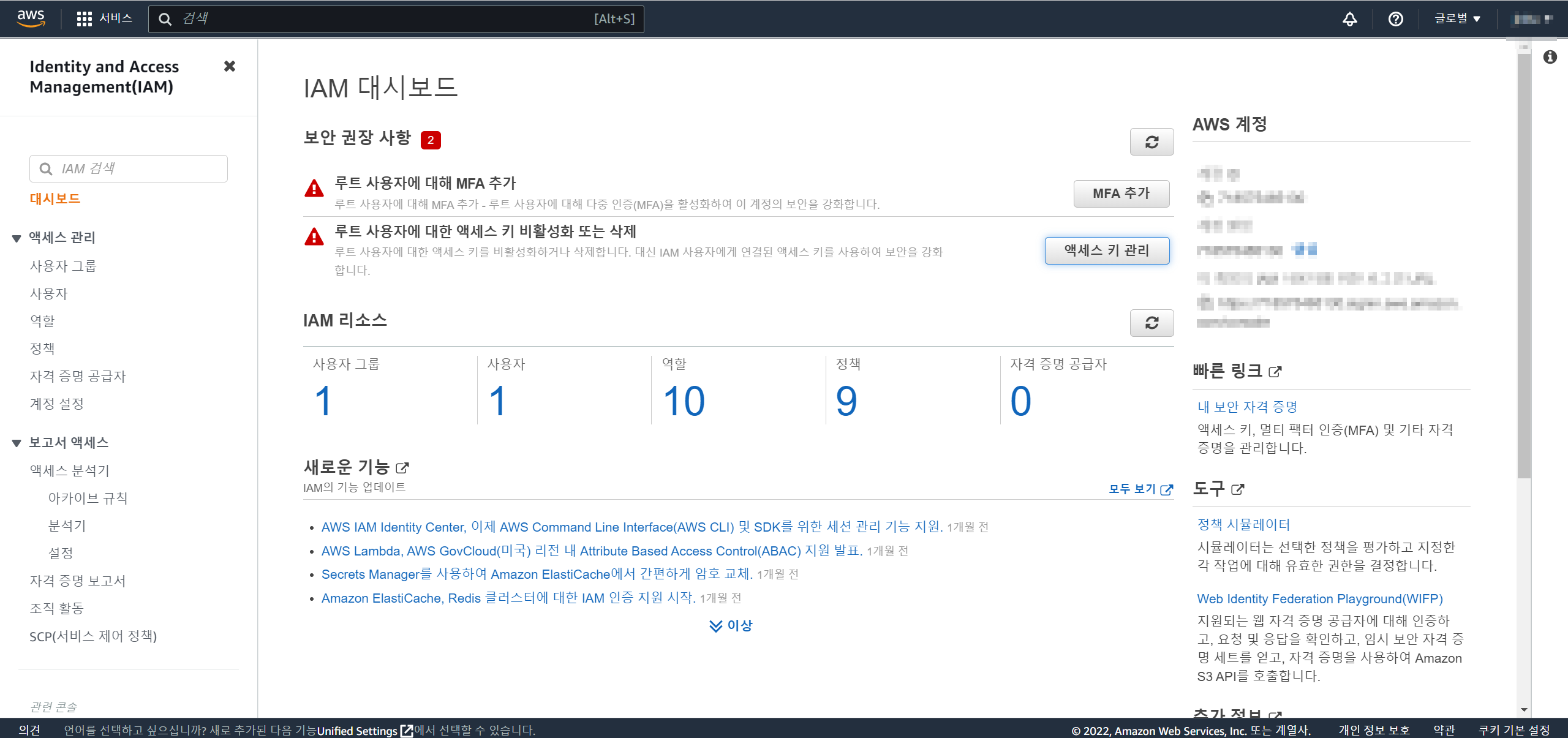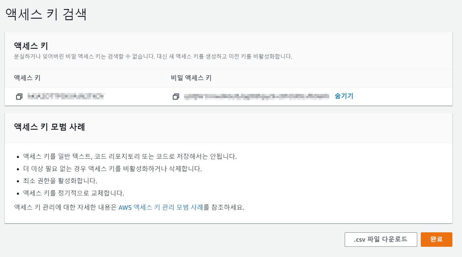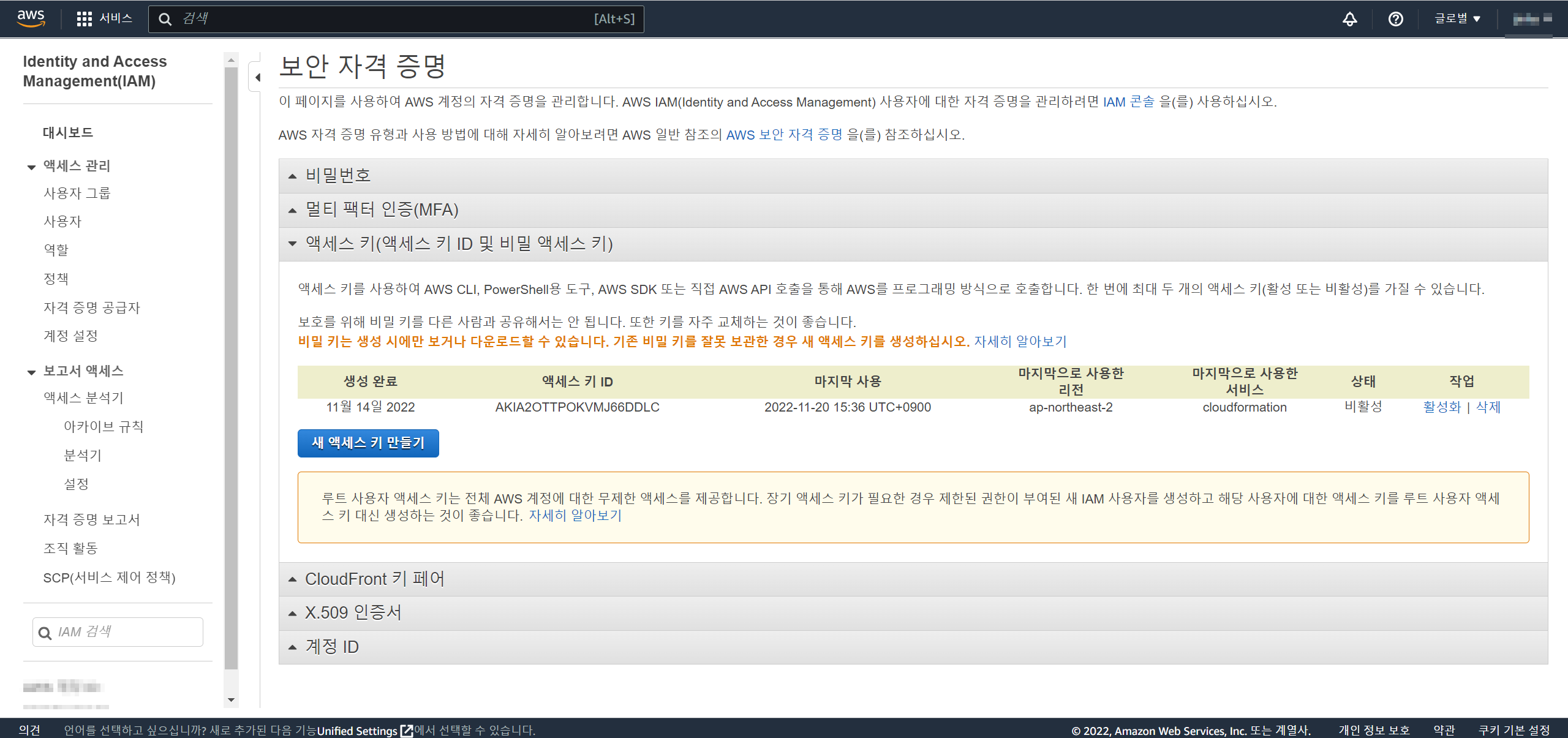 화면에 액세스 키 ID를 이미 만든 화면으로 보이는데 이걸 따라 하는 분들은 없을 거다.