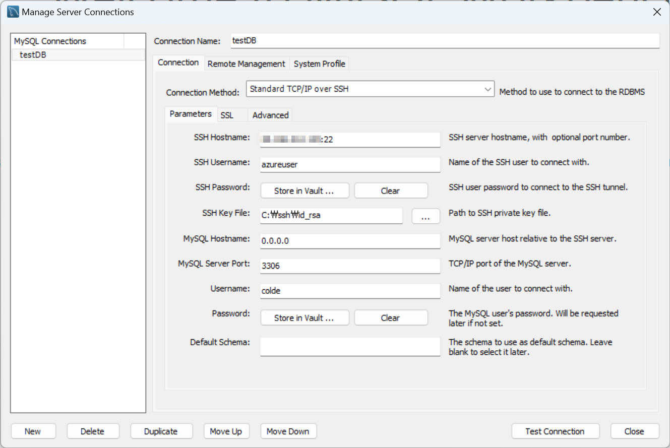MySQL Hostname : docker안에 MySQL에 연결될 IP. 나는 따로 설정 안했기 때문에 0.0.0.0으로 했다