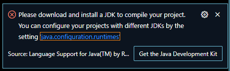 하지만 VS Code java 확장이 내가 설치한 java를 자동으로 설정하지 않기 때문에 아래와 같은 에러가 난다.
